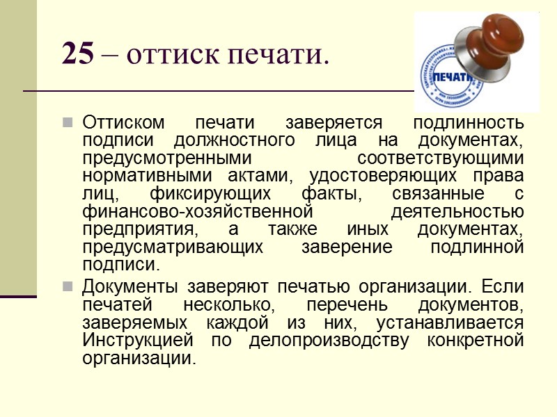 25 – оттиск печати. Оттиском печати заверяется подлинность подписи должностного лица на документах, предусмотренными соответствующими нормативными актами, удостоверяющих права лиц, фиксирующих факты, связанные с финансово-хозяйственной деятельностью предприятия, а также иных документах, предусматривающих заверение подлинной подписи. Документы заверяют печатью организации. Если печатей несколько, перечень документов, заверяемых каждой из них, устанавливается Инструкцией по делопроизводству конкретной организации.
