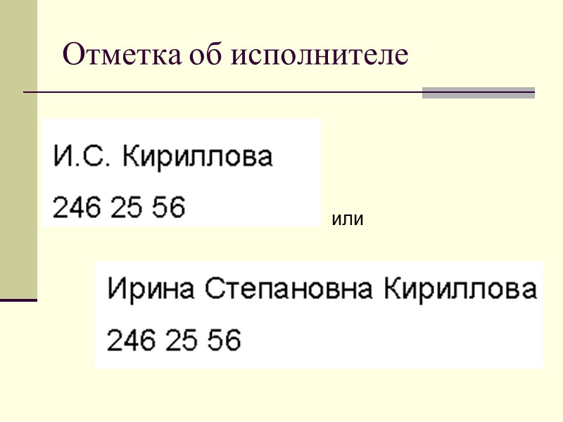 27 - отметка об исполнителе Отметка об исполнителе включает инициалы и фамилию исполнителя документа, и номер его служебного телефона. Отметку располагают на лицевой стороне или (при отсутствии места) на оборотной стороне последнего листа документа в левом нижнем углу,