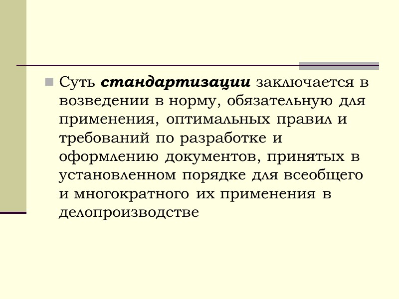 Суть стандартизации заключается в возведении в норму, обязательную для применения, оптимальных правил и требований по разработке и оформлению документов, принятых в установленном порядке для всеобщего и многократного их применения в делопроизводстве
