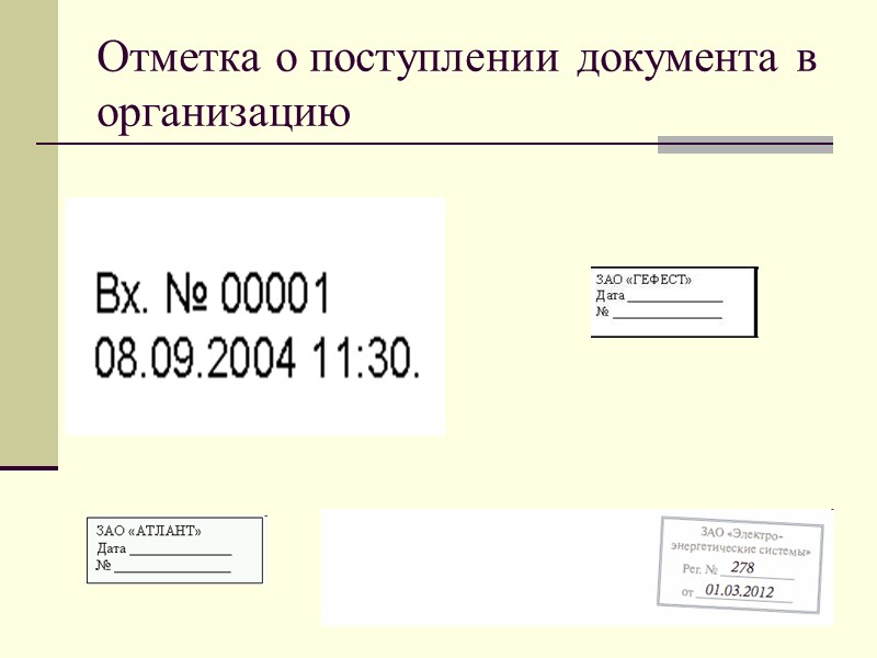 Отметка о поступлении документа в организацию