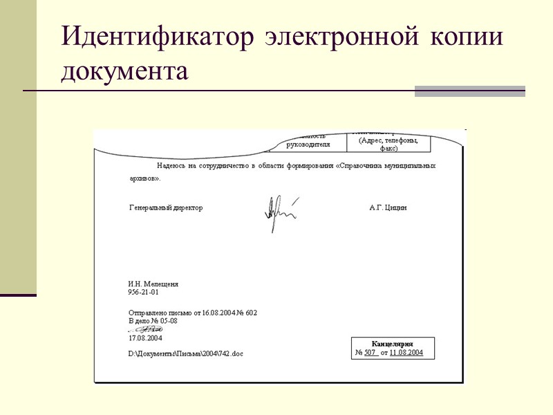 30 - идентификатор электронной копии документа идентификатор электронной копии документа проставляется на нижнем поле каждого листа и содержит наименование файла; дату или другие поисковые данные, устанавливаемые в организации,