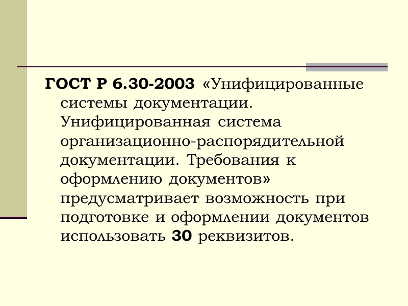 ГОСТ Р 6.30-2003 «Унифицированные системы документации. Унифицированная система организационно-распорядительной документации. Требования к оформлению документов» предусматривает возможность при подготовке и оформлении документов использовать 30 реквизитов.