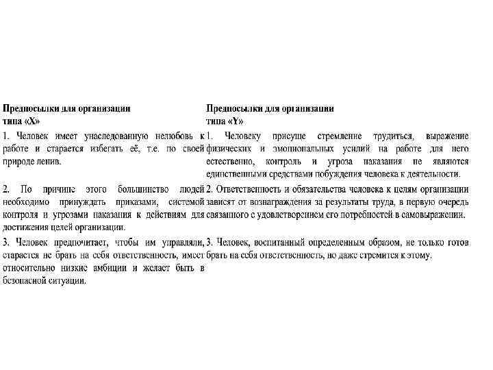 • Теория «X» . • В соответствии с ней среднему человеку присуще отвращение к труду и желание избежать его при первой же возможности. Поэтому требуется принуждать большинство людей различными методами вплоть до наказаний к выполнению возложенных на них обязанностей и непрерывно контролировать их действия.