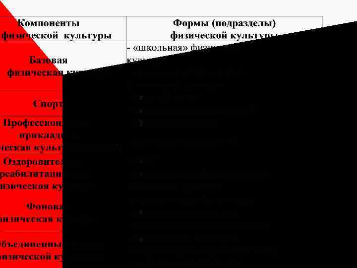 Базовая физическая культура • - “школьная” физическая культура Обеспечивает физическое образование (в соответствии с Программой) и базовый уровень ОФП. Обязательная форма. • - пролонгирующие формы физической культуры Дальнейшее повышение уровня базовой физической подготовленности или сохранение достигнутого уровня. Добровольная форма.