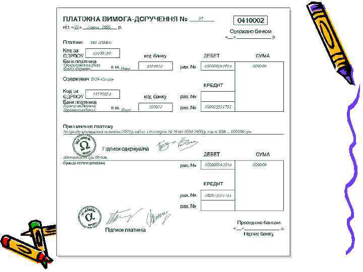 Платіжне доручення — це документ, який містить наказ платника банку про списання з його рахунку певної суми та перерахування її на рахунок одержувача