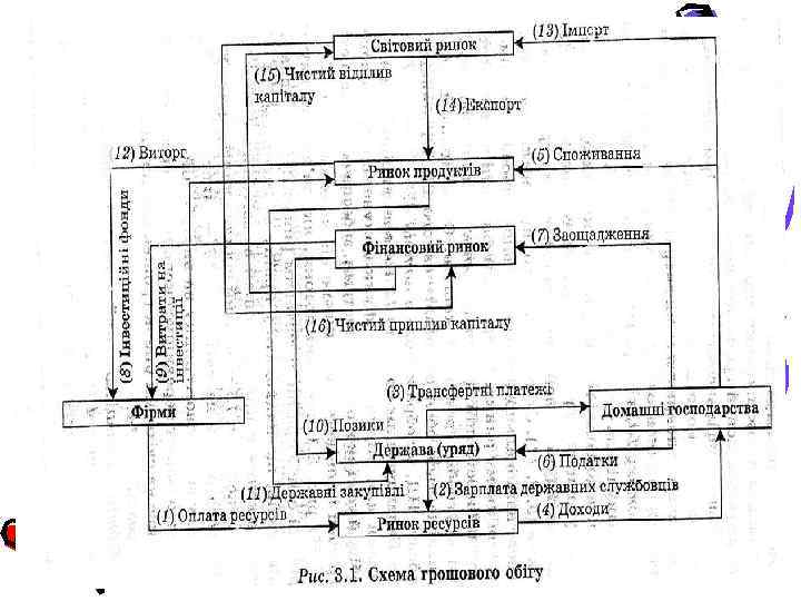 Основні ринки, через які здійснюється більшість грошових відносин між економічними суб'єктами: • ринок продуктів, де реалізується створений фірмами національний продукт (ВВП); • ринок ресурсів, на якому фірми купують необхідпі для виробництва ресурси (робочу силу, землю, будівлі, капітал і природні ресурси); • фінансовий ринок, де реалізуються вільні грошові кошти; • світовий ринок, через який здійснюється зв'язок внутрішньої економічної системи із "зовнішнім" світом.
