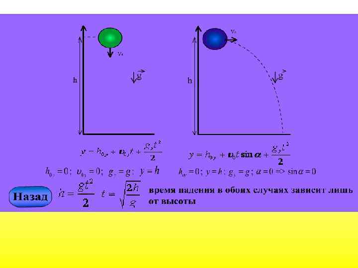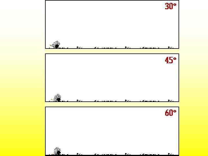 Движение тел в поле тяжести Земли g - ускорение свободного падения в поле тяжести Земли. Подставляя t из первого уравнения во второе, находим уравнение траектории движения снаряда: Y = X tgj - (g/2 v 2)(1 + tg 2 j) X 2 Если пушка расположена в точке с координатами (0, 0), то снаряд будет двигаться по траектории, которая описывается следующими уравнения-ми: X = (vcosj)t Y = (vsinj)t - gt 2/2, где v - скорость снаряда вдоль ствола пушки, j - угол между стволом пушки и горизонтом (ось X), t - время, Из этого уравнения находим максимальную дальность стрельбы Xmax (при этом Y=0) и максимальную высоту полёта Ymax (первая производная Y по координате X равна нулю): Xmax = v 2 sin(2 j)/g Ymax = v 2 sin 2 j/2 g Из первого уравнения видно, что максимальная дальность полёта снаряда достигается при стрельбе под углом j, равном 45°.
