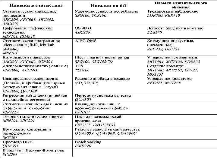 Программа обучения сотрудников 1. Методология «Шесть сигм» . Инфраструктура и алгоритм проекта «Шесть сигм» . 2. Простые числовые методы и их программное обеспечение: – – – контрольные листки, диаграмма "причина - результат", гистограмма, диаграмма Парето, расслоение, корреляционное поле рассеяния 3. Измеряемые характеристики качества - случайные величины. Статистическая модель нормального распределения. 3. Статистическое управление процессами. Контрольные карты. Программное обеспечение. 4. Семь методов анализа вербальных данных, выраженных в виде субъективных суждений: – – – – диаграмма сродства (affinity diagram); диаграмма (график) связей (interrelationship diagram); древовидная диаграмма (tree diagram); матричная диаграмма или таблица качества (matrix diagram or quality table); стрелочная диаграмма (arrow diagram) (применяются диаграммы Ганта или сетевые графики); диаграмма процесса осуществления программы (Process Decision Program Chart – PDPC) Матрица приоритетов (анализ матричных данных) (matrix data analysis) 5. Числовые характеристики. Выборочные оценки. 6. Выборочные распределения и доверительные интервалы статистик (t, F и G статистики). 7. Статистические выводы, проверка гипотез