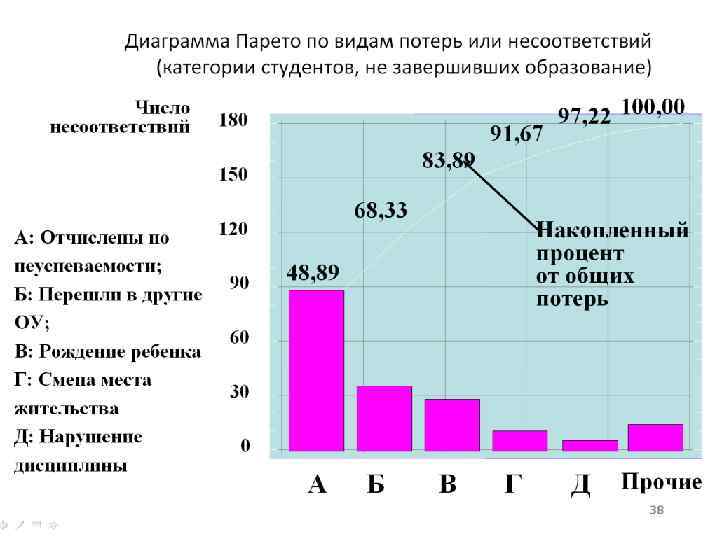 Диаграмма Парето по типам дефектов Число дефектных деталей 180 А: Отклонение 150 в размерах 120 Б: Раковины В: Царапины 90 Г: Трещины 60 Д: Изгиб 91, 67 97, 22 100, 00 83, 89 68, 33 Накопленный процент от общего числа дефектов. 48, 89 30 0 А Б В Г Д Прочие