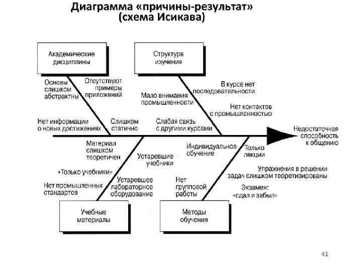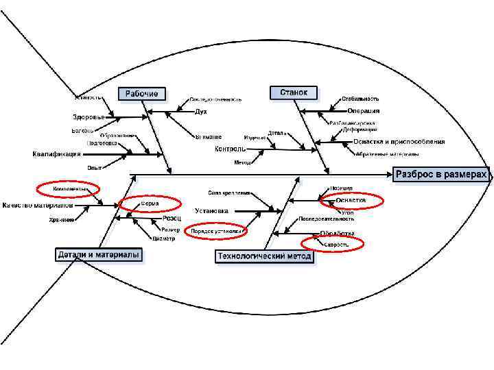 Диаграмма «причины-результат» (схема Исикава) Диаграмма «причины-результат» - схема, характеризующая зависимость между полученными результатами в области качества и причинами, воздействующими на эти результаты. Результат процесса зависит от многочисленных факторов, между которыми существуют отношения причина-результат. Можно определить структуру этих многофакторных отношений благодаря их систематическому изучению. Трудно решить сложные проблемы, не зная этой структуры, которая представляет собой цепь причин и результатов. Диаграмма причин и результатов - средство, позволяющее выразить эти отношения в простой и доступной форме.