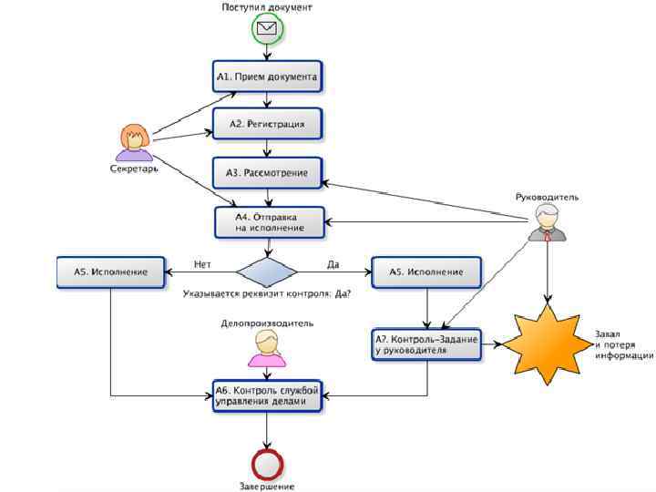 Блок-схема процесса Блок-схема – инструмент для описания бизнес-процесса Обозначения, используемые на блок-схеме процесса: Начало и конец процесса. Может использоваться как овал, так и круг. Прямоугольник с прямыми или скругленными углами – операция процесса. Ромб – оператор ветвления. Им обозначают операции, в ходе которых нужно сделать выбор, после которого возможно 2 сценария дальнейшего хода процесса. Треугольник – этап временного ожидания-складирования Стрелка указывает направление хода процесса. Параллелограмм – обозначение любого объекта (материального или информационного). Прямоугольник с неровной стороной обозначает документ или информацию.