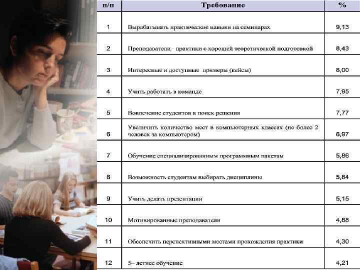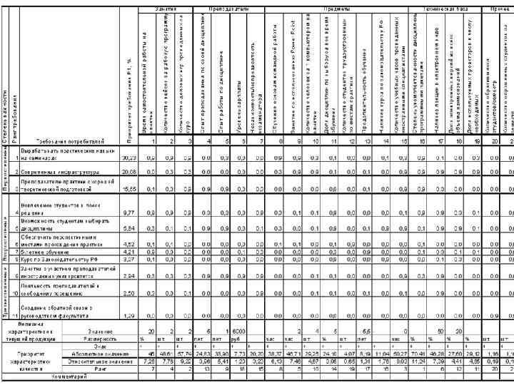 Таблица приоритетов № п/п Требование Прио ритет, % № п/п Требование Приор итет, % 1 Вырабатывать практические навыки на семинарах 9, 13 13 Курс по Законодательству РФ 3, 47 2 Преподаватели– практики с хорошей теоретической подготовкой 8, 43 14 Давать лекции в электронном виде 2, 81 3 Интересные и доступные примеры (кейсы) 8, 00 15 Проводить занятия с участием преподавателей иностранных университетов 2, 80 4 Учить работать в команде 7, 95 16 Наличие и доступ электронных версий литературы 2, 55 5 Вовлечение студентов в поиск решения 7, 77 17 Лояльность преподавателей к свободному посещению 2, 50 6 Увеличить количество мест в компьютерных классах (не более 2 человек за компьютером) 6, 97 18 Использовать проекторы на занятиях 1, 89 7 Обучение специализированным программным пакетам 5, 86 19 Создание обратной связи с руководством факультета 1, 29 8 Возможность студентам выбирать дисциплины 5, 84 20 Проводить компьютерные тестирования 1, 01 9 Учить делать презентации 5, 15 21 Наличие указателей в корпусах 0, 93 10 Мотивированные преподаватели 4, 88 22 Ежемесячная проверка знаний 0, 88 11 Обеспечить перспективными местами прохождения практики 4, 30 23 Создать электронную библиотеку вуза 0, 81 12 5– летнее обучение 4, 21 24 Соизмеримый уровень сложности домашних и классных заданий 0, 57