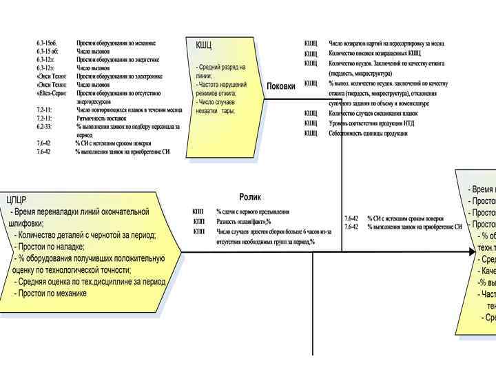 Развертывание требований между процессами ЦПЦР Входные показатели Внутренние показатели - Время переналадки линий окончательной шлифовки; - Количество деталей с чернотой за период; - Простои по наладке; - % оборудования, получившего положительную оценку по технологической точности; - Оценка по технологической. дисциплине - Простои по механике Ролик Показатели требований КПП: 1. % сдачи с первого предъявления 2. Разность «план/факт» , 3. Число простоев сборки больше 6 часов из-за отсутствия необходимых размерных групп Внешние показатели