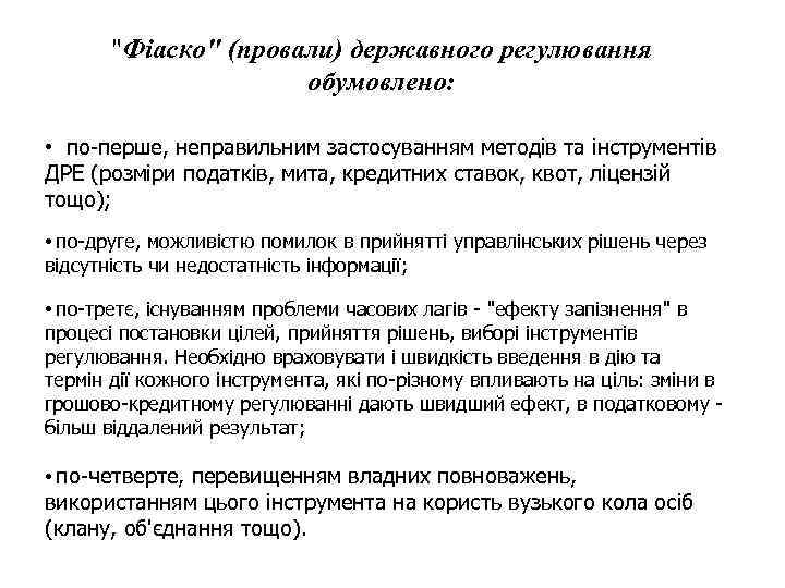 "Фіаско" (провали) державного регулювання обумовлено: • по-перше, неправильним застосуванням методів та інструментів ДРЕ (розміри податків, мита, кредитних ставок, квот, ліцензій тощо); • по-друге, можливістю помилок в прийнятті управлінських рішень через відсутність чи недостатність інформації; • по-третє, існуванням проблеми часових лагів - "ефекту запізнення" в процесі постановки цілей, прийняття рішень, виборі інструментів регулювання. Необхідно враховувати і швидкість введення в дію та термін дії кожного інструмента, які по-різному впливають на ціль: зміни в грошово-кредитному регулюванні дають швидший ефект, в податковому більш віддалений результат; • по-четверте, перевищенням владних повноважень, використанням цього інструмента на користь вузького кола осіб (клану, об'єднання тощо).