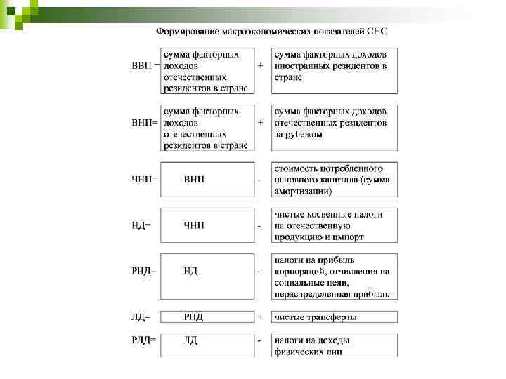 Расчет ВВП распределительным методом (по источникам доходов) Сумма доходов всех участников производства: ВВП = ОТ + ЧНпроизводство и импорт + Вал. Прибыль + ВСД ОТ – оплата труда начисленная, в денежной и в натуральной форме, включает фактически и условно исчисленные отчисления на социальное страхование Вал. Прибыль - валовая прибыль – часть добавленной стоимости, которая остается у производителей после вычета расходов, связанных с ОТ и ЧН; включает потребление основного капитала ВСД - валовой смешанный доход – прибыль и вознаграждение за работу владельцев (работников) некорпоративных предприятий