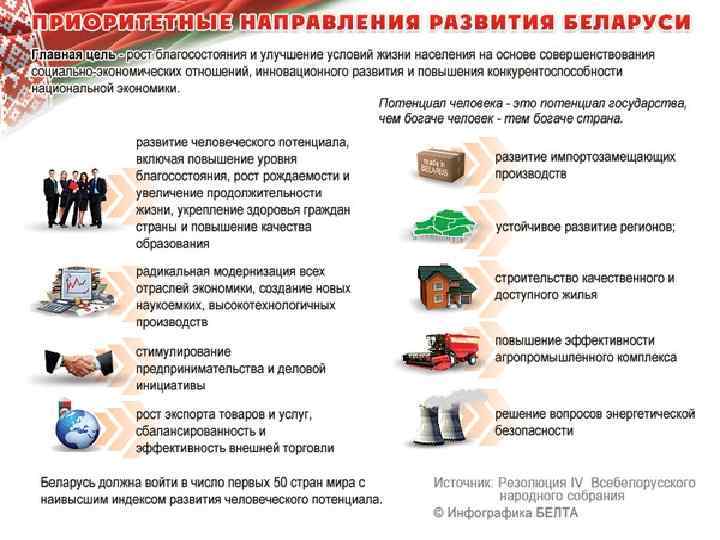 Приоритеты социально-экономического развития Республики Беларусь на 2011 -2015 гг. : 1. развитие человеческого потенциала; 2. радикальная модернизация всех секторов экономики, создание новых наукоемких, высокотехнологичных производств; НИС; 3. стимулирование предпринимательства и деловой инициативы; 4. рост экспорта товаров и услуг, сбалансированность и эффективность внешней торговли; 5. развитие импортозамещающих производств; 6. устойчивое развитие регионов; 7. строительство качественного и доступного жилья, развитие рынка арендного жилья; 8. повышение эффективности АПК.
