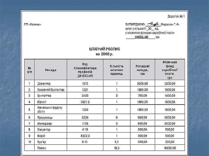 Штатний розпис закріплює: n n перелік посад і професій; чисельність штатних одиниць; розмір посадових окладів, надбавок та доплат за умови, що вони передбачені системою оплати праці і мають постійний характер (наприклад, доплати за вислугу років на підприємстві); місячний фонд заробітної плати