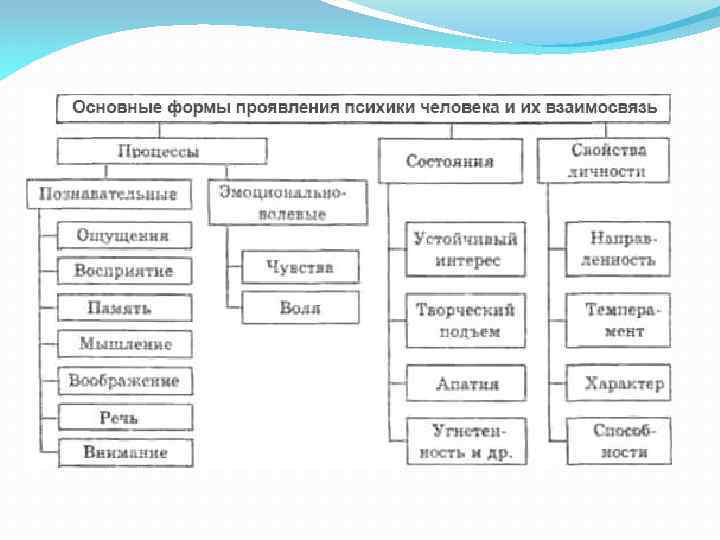 Психические процессы, психические состояния и психические свойства проявляются в трех основных сферах психики – познавательной (познавательные процессы, состояния и свойства), эмоциональной (эмоциональные процессы состояния и свойства) и волевой (волевые процессы, состояния и свойства).