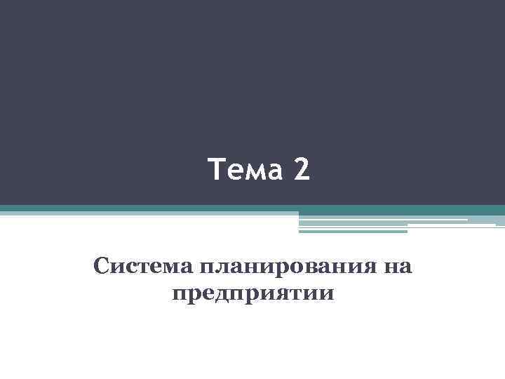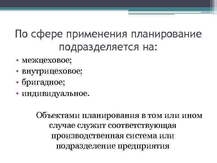По сфере применения планирование подразделяется на: • • межцеховое; внутрицеховое; бригадное; индивидуальное. Объектами планирования в том или ином случае служит соответствующая производственная система или подразделение предприятия