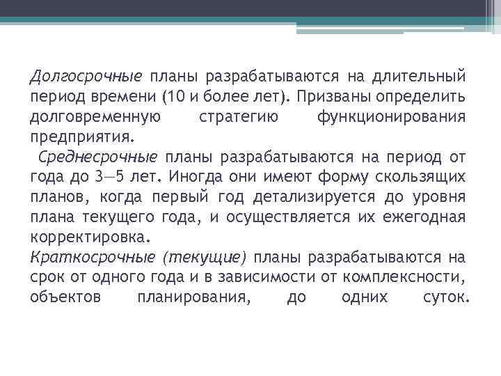 Долгосрочные планы разрабатываются на длительный период времени (10 и более лет). Призваны определить долговременную стратегию функционирования предприятия. Среднесрочные планы разрабатываются на период от года до 3— 5 лет. Иногда они имеют форму скользящих планов, когда первый год детализируется до уровня плана текущего года, и осуществляется их ежегодная корректировка. Краткосрочные (текущие) планы разрабатываются на срок от одного года и в зависимости от комплексности, объектов планирования, до одних суток.