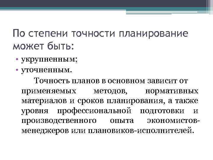 По степени точности планирование может быть: • укрупненным; • уточненным. Точность планов в основном зависит от применяемых методов, нормативных материалов и сроков планирования, а также уровня профессиональной подготовки и производственного опыта экономистовменеджеров или плановиков-исполнителей.