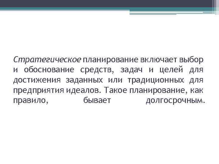 Стратегическое планирование включает выбор и обоснование средств, задач и целей для достижения заданных или традиционных для предприятия идеалов. Такое планирование, как правило, бывает долгосрочным.
