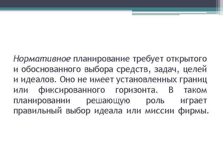 Нормативное планирование требует открытого и обоснованного выбора средств, задач, целей и идеалов. Оно не имеет установленных границ или фиксированного горизонта. В таком планировании решающую роль играет правильный выбор идеала или миссии фирмы.
