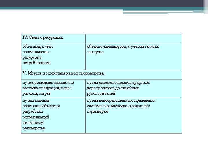 IV. Связь с ресурсами: объемная, путем сопоставления ресурсов с потребностями объемно-календарная, с учетом запуска -выпуска V. Методы воздействия на ход производства: путем доведения заданий по выпуску продукции, норм расхода, затрат путем анализа состояния объекта и разработки рекомендаций линейному руководству путем доведения планов-графиков хода процессов до линейных руководителей путем непосредственного приведения системы в равновесие, к заданным параметрам