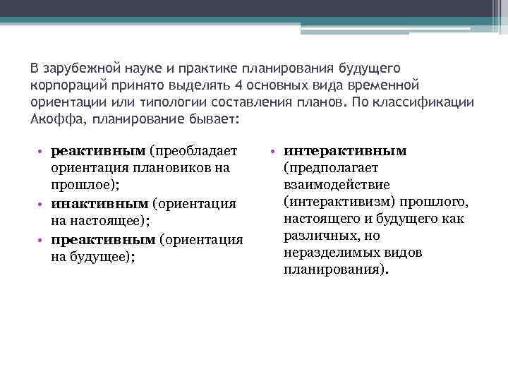 В зарубежной науке и практике планирования будущего корпораций принято выделять 4 основных вида временной ориентации или типологии составления планов. По классификации Акоффа, планирование бывает: • реактивным (преобладает ориентация плановиков на прошлое); • инактивным (ориентация на настоящее); • преактивным (ориентация на будущее); • интерактивным (предполагает взаимодействие (интерактивизм) прошлого, настоящего и будущего как различных, но неразделимых видов планирования).
