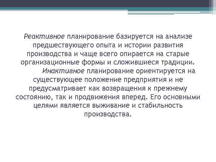 Реактивное планирование базируется на анализе предшествующего опыта и истории развития производства и чаще всего опирается на старые организационные формы и сложившиеся традиции. Инактивное планирование ориентируется на существующее положение предприятия и не предусматривает как возвращения к прежнему состоянию, так и продвижения вперед. Его основными целями является выживание и стабильность производства.