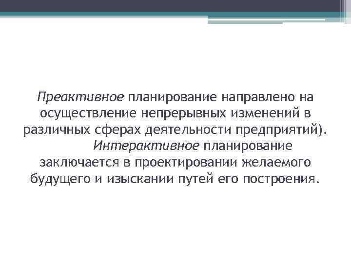 Преактивное планирование направлено на осуществление непрерывных изменений в различных сферах деятельности предприятий). Интерактивное планирование заключается в проектировании желаемого будущего и изыскании путей его построения.