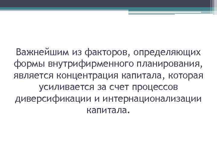 Важнейшим из факторов, определяющих формы внутрифирменного планирования, является концентрация капитала, которая усиливается за счет процессов диверсификации и интернационализации капитала.