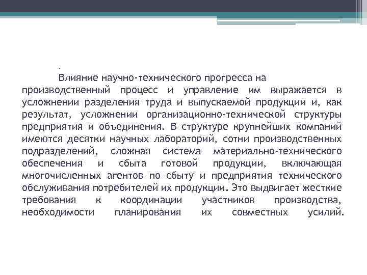 . Влияние научно-технического прогресса на производственный процесс и управление им выражается в усложнении разделения труда и выпускаемой продукции и, как результат, усложнении организационно-технической структуры предприятия и объединения. В структуре крупнейших компаний имеются десятки научных лабораторий, сотни производственных подразделений, сложная система материально-технического обеспечения и сбыта готовой продукции, включающая многочисленных агентов по сбыту и предприятия технического обслуживания потребителей их продукции. Это выдвигает жесткие требования к координации участников производства, необходимости планирования их совместных усилий.