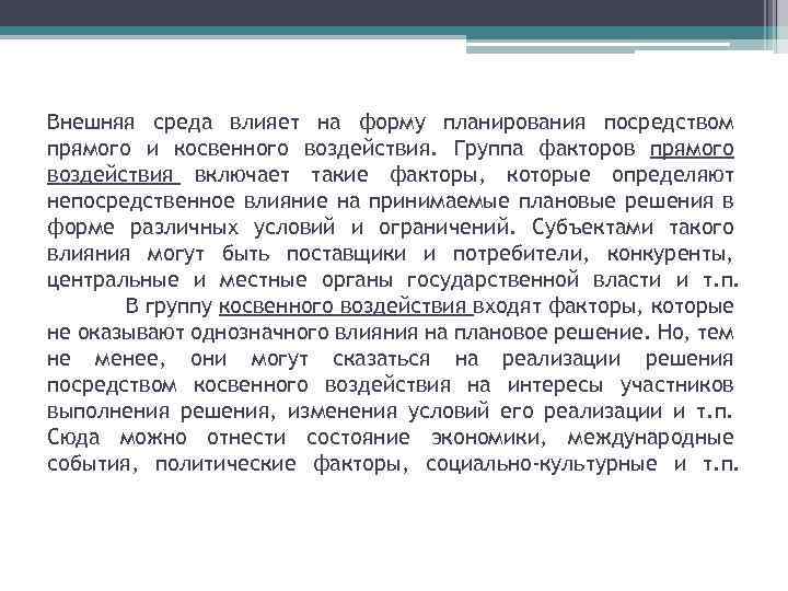 Внешняя среда влияет на форму планирования посредством прямого и косвенного воздействия. Группа факторов прямого воздействия включает такие факторы, которые определяют непосредственное влияние на принимаемые плановые решения в форме различных условий и ограничений. Субъектами такого влияния могут быть поставщики и потребители, конкуренты, центральные и местные органы государственной власти и т. п. В группу косвенного воздействия входят факторы, которые не оказывают однозначного влияния на плановое решение. Но, тем не менее, они могут сказаться на реализации решения посредством косвенного воздействия на интересы участников выполнения решения, изменения условий его реализации и т. п. Сюда можно отнести состояние экономики, международные события, политические факторы, социально-культурные и т. п.