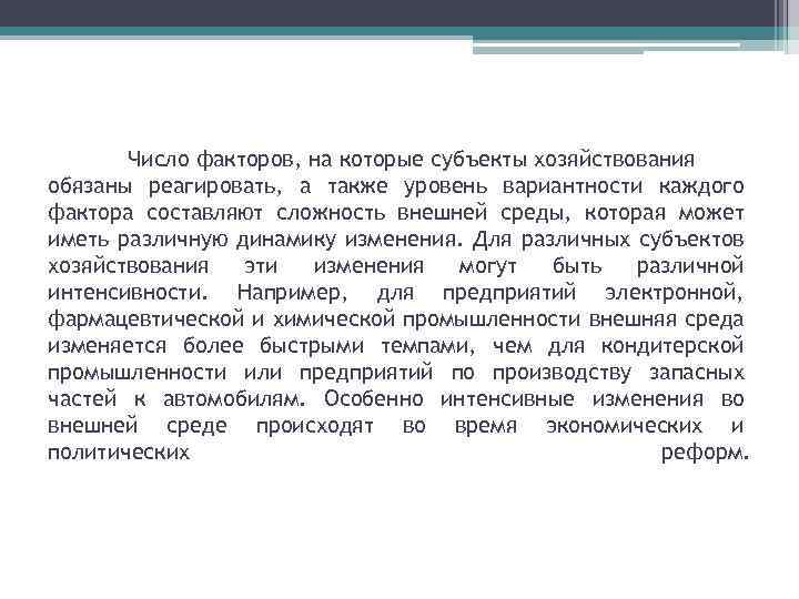 Число факторов, на которые субъекты хозяйствования обязаны реагировать, а также уровень вариантности каждого фактора составляют сложность внешней среды, которая может иметь различную динамику изменения. Для различных субъектов хозяйствования эти изменения могут быть различной интенсивности. Например, для предприятий электронной, фармацевтической и химической промышленности внешняя среда изменяется более быстрыми темпами, чем для кондитерской промышленности или предприятий по производству запасных частей к автомобилям. Особенно интенсивные изменения во внешней среде происходят во время экономических и политических реформ.