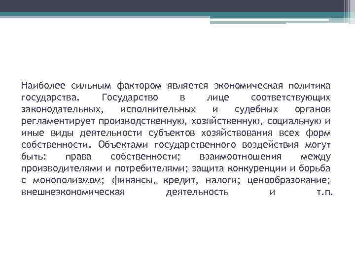 Наиболее сильным фактором является экономическая политика государства. Государство в лице соответствующих законодательных, исполнительных и судебных органов регламентирует производственную, хозяйственную, социальную и иные виды деятельности субъектов хозяйствования всех форм собственности. Объектами государственного воздействия могут быть: права собственности; взаимоотношения между производителями и потребителями; защита конкуренции и борьба с монополизмом; финансы, кредит, налоги; ценообразование; внешнеэкономическая деятельность и т. п.