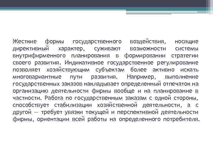 Жесткие формы государственного воздействия, носящие директивный характер, суживают возможности системы внутрифирменного планирования в формировании стратегии своего развития. Индикативное государственное регулирование позволяет хозяйствующим субъектам более активно искать многовариантные пути развития. Например, выполнение государственных заказов накладывает определенный отпечаток на организацию деятельности фирмы вообще и на планирование в частности. Работа по государственным заказам с одной стороны, способствует стабилизации хозяйственной деятельности, а с другой — требует увязки текущей и перспективной деятельности фирмы, ориентации всей работы на определенного потребителя.