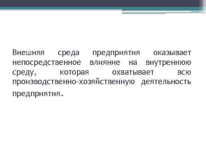 Внешняя среда предприятия оказывает непосредственное влияние на внутреннюю среду, которая охватывает всю производственно-хозяйственную деятельность предприятия.