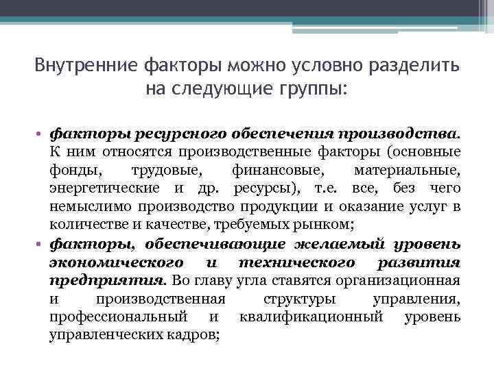 Внутренние факторы можно условно разделить на следующие группы: • факторы ресурсного обеспечения производства. К ним относятся производственные факторы (основные фонды, трудовые, финансовые, материальные, энергетические и др. ресурсы), т. е. все, без чего немыслимо производство продукции и оказание услуг в количестве и качестве, требуемых рынком; • факторы, обеспечивающие желаемый уровень экономического и технического развития предприятия. Во главу угла ставятся организационная и производственная структуры управления, профессиональный и квалификационный уровень управленческих кадров;