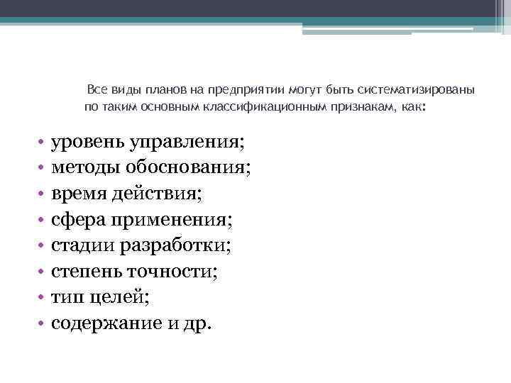 Все виды планов на предприятии могут быть систематизированы по таким основным классификационным признакам, как: • • уровень управления; методы обоснования; время действия; сфера применения; стадии разработки; степень точности; тип целей; содержание и др.