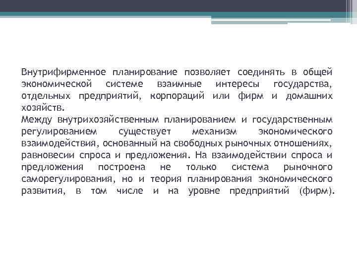 Внутрифирменное планирование позволяет соединять в общей экономической системе взаимные интересы государства, отдельных предприятий, корпораций или фирм и домашних хозяйств. Между внутрихозяйственным планированием и государственным регулированием существует механизм экономического взаимодействия, основанный на свободных рыночных отношениях, равновесии спроса и предложения. На взаимодействии спроса и предложения построена не только система рыночного саморегулирования, но и теория планирования экономического развития, в том числе и на уровне предприятий (фирм).