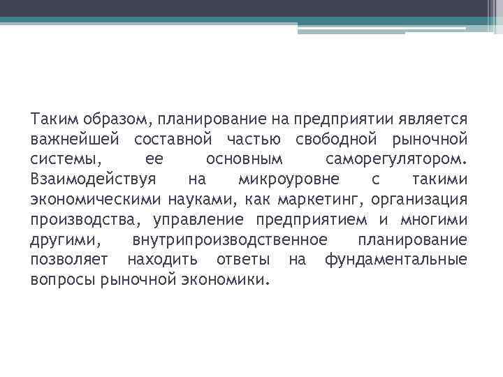 Таким образом, планирование на предприятии является важнейшей составной частью свободной рыночной системы, ее основным саморегулятором. Взаимодействуя на микроуровне с такими экономическими науками, как маркетинг, организация производства, управление предприятием и многими другими, внутрипроизводственное планирование позволяет находить ответы на фундаментальные вопросы рыночной экономики.
