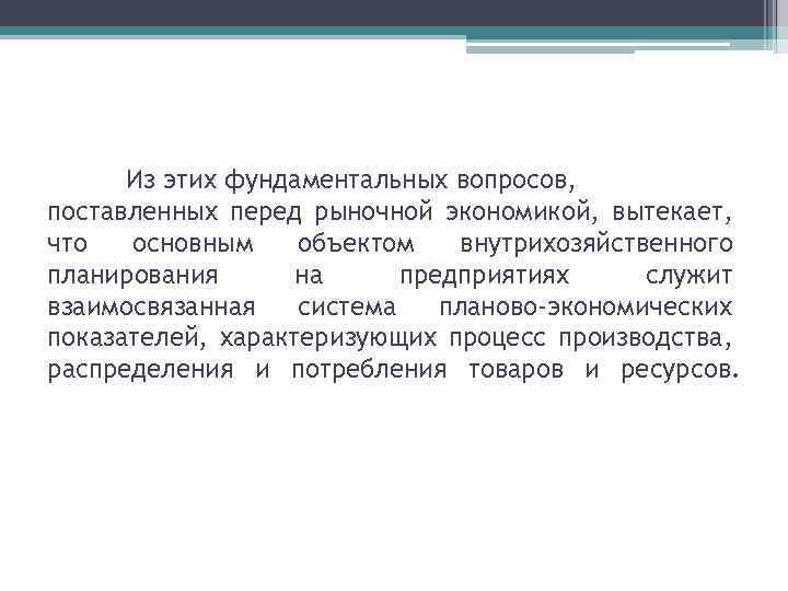 Из этих фундаментальных вопросов, поставленных перед рыночной экономикой, вытекает, что основным объектом внутрихозяйственного планирования на предприятиях служит взаимосвязанная система планово-экономических показателей, характеризующих процесс производства, распределения и потребления товаров и ресурсов.