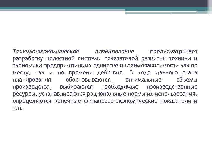 Технико-экономическое планирование предусматривает разработку целостной системы показателей развития техники и экономики предпри ятияв их единстве и взаимозависимости как по месту, так и по времени действия. В ходе данного этапа планирования обосновываются оптимальные объемы производства, выбираются необходимые производственные ресурсы, устанавливаются рациональные нормы их использования, определяются конечные финансово-экономические показатели и т. п.