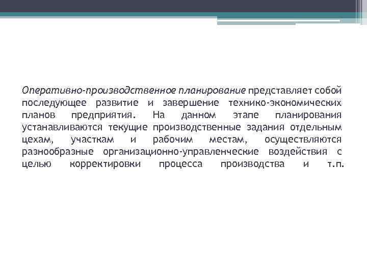 Оперативно-производственное планирование представляет собой последующее развитие и завершение технико-экономических планов предприятия. На данном этапе планирования устанавливаются текущие производственные задания отдельным цехам, участкам и рабочим местам, осуществляются разнообразные организационно-управленческие воздействия с целью корректировки процесса производства и т. п.
