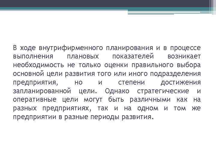 В ходе внутрифирменного планирования и в процессе выполнения плановых показателей возникает необходимость не только оценки правильного выбора основной цели развития того или иного подразделения предприятия, но и степени достижения запланированной цели. Однако стратегические и оперативные цели могут быть различными как на разных предприятиях, так и на одном и том же предприятии в разные периоды развития.