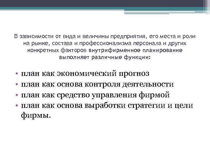 В зависимости от вида и величины предприятия, его места и роли на рынке, состава и профессионализма персонала и других конкретных факторов внутрифирменное планирование выполняет различные функции: • • план как экономический прогноз план как основа контроля деятельности план как средство управления фирмой план как основа выработки стратегии и цели фирмы.