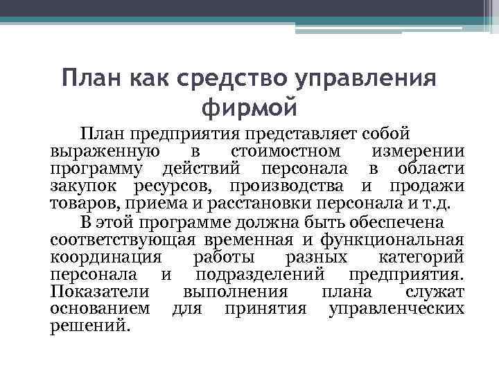 План как средство управления фирмой План предприятия представляет собой выраженную в стоимостном измерении программу действий персонала в области закупок ресурсов, производства и продажи товаров, приема и расстановки персонала и т. д. В этой программе должна быть обеспечена соответствующая временная и функциональная координация работы разных категорий персонала и подразделений предприятия. Показатели выполнения плана служат основанием для принятия управленческих решений.