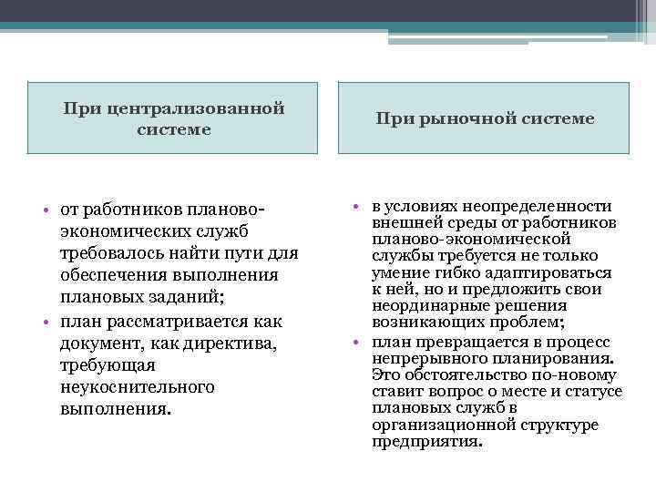 При централизованной системе • от работников плановоэкономических служб требовалось найти пути для обеспечения выполнения плановых заданий; • план рассматривается как документ, как директива, требующая неукоснительного выполнения. При рыночной системе • в условиях неопределенности внешней среды от работников планово-экономической службы требуется не только умение гибко адаптироваться к ней, но и предложить свои неординарные решения возникающих проблем; • план превращается в процесс непрерывного планирования. Это обстоятельство по-новому ставит вопрос о месте и статусе плановых служб в организационной структуре предприятия.