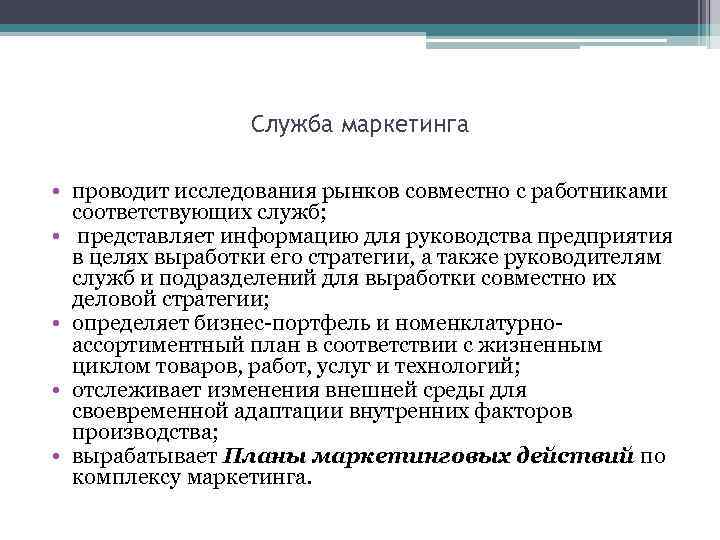 Служба маркетинга • проводит исследования рынков совместно с работниками соответствующих служб; • представляет информацию для руководства предприятия в целях выработки его стратегии, а также руководителям служб и подразделений для выработки совместно их деловой стратегии; • определяет бизнес-портфель и номенклатурноассортиментный план в соответствии с жизненным циклом товаров, работ, услуг и технологий; • отслеживает изменения внешней среды для своевременной адаптации внутренних факторов производства; • вырабатывает Планы маркетинговых действий по комплексу маркетинга.